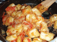The other dish I tried tonight was fried cassava and tomatoes chokha. Let's see, the reason for trying this dish was to try Meatless Mondays. Yes, yes, I know, I made beef patties, but that really does not count, does it? since it was/is for my son's lunch the next day?